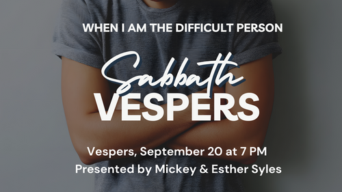 Don't miss our Sabbath Evening Vespers. Come to learn about how not to be the difficult person and what to do if you discover you have been the difficult person. Led by Mickey & Esther Sayles.