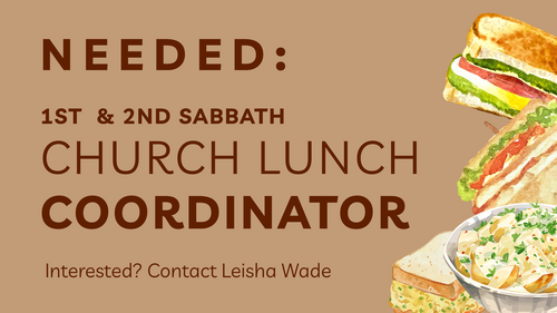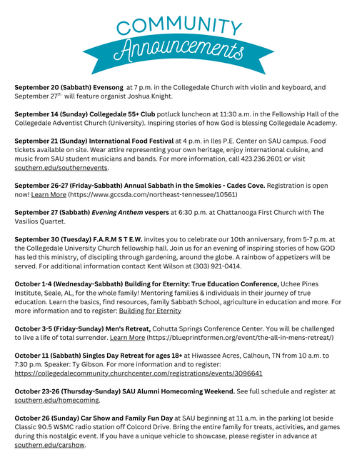 Choir is not meeting September 22nd and resumes practice on Wednesdays beginning October 1st at 7:15 p.m. September 27 (Sabbath) Church Fellowship Luncheon in the gym. September 27 (Sabbath) Sabbath School Council Meeting 2 p.m., in gym. September 27 (Saturday) Worship & Gym Night for all ages 8-10 p.m. September 28 (Sunday) Wedding Shower 3-5 p.m. Bethany Mitchell & Jesse Felan. October 3 (Friday) Youth Vespers 6 p.m. October 5 (Sunday) Fall Festival 3-6 p.m. Please come lend a hand, also bring friends and family! Sign-up sheet in the lobby to help, or text (423) 303-8049. October 31 (Friday) Save the Date! Reformation Day 5 p.m. You won’t want to miss this event! Home School Students are invited to join the LCAS's music program, including K-3 Choir, 4th grade Recorders, 5th grade Beginner Band, and 6th– 8th grade Advanced Band. If interested, contact school office for more details. Potluck Host/Hostess Needed: First and/or second Sabbath each month. Current menu is sandwiches first Sabbath/haystacks second Sabbath, but that would be up to the leader to change at will. Contact Leisha at (423) 413-7730. Driver Needed: Apison Food Pantry driver needed for Ooltewah pickup on Sunday mornings. Please see Imogene Green. |